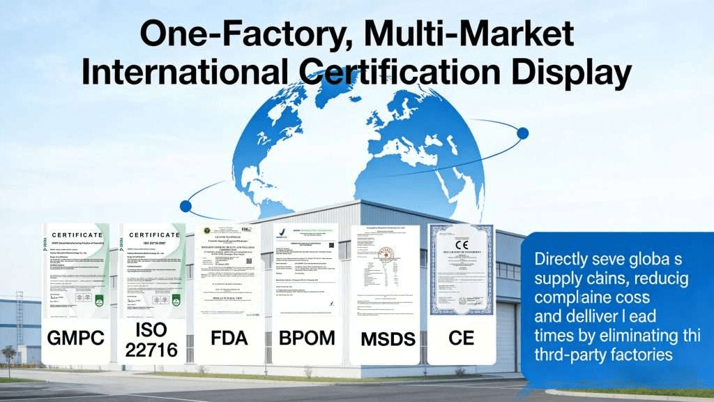 GMPC, ISO 22716, FDA, BPOM, CPNP, CE, Halal and more, enabling global market access.