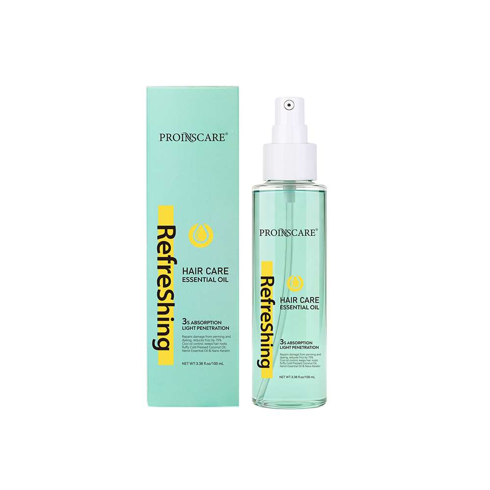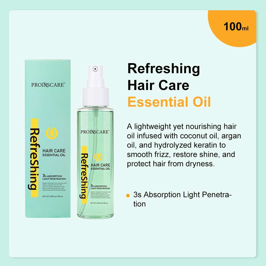 Refreshing Hair Care Essential Oil – A lightweight yet nourishing hair oil infused with coconut oil, argan oil, and hydrolyzed keratin to smooth frizz, restore shine, and protect hair from dryness.
